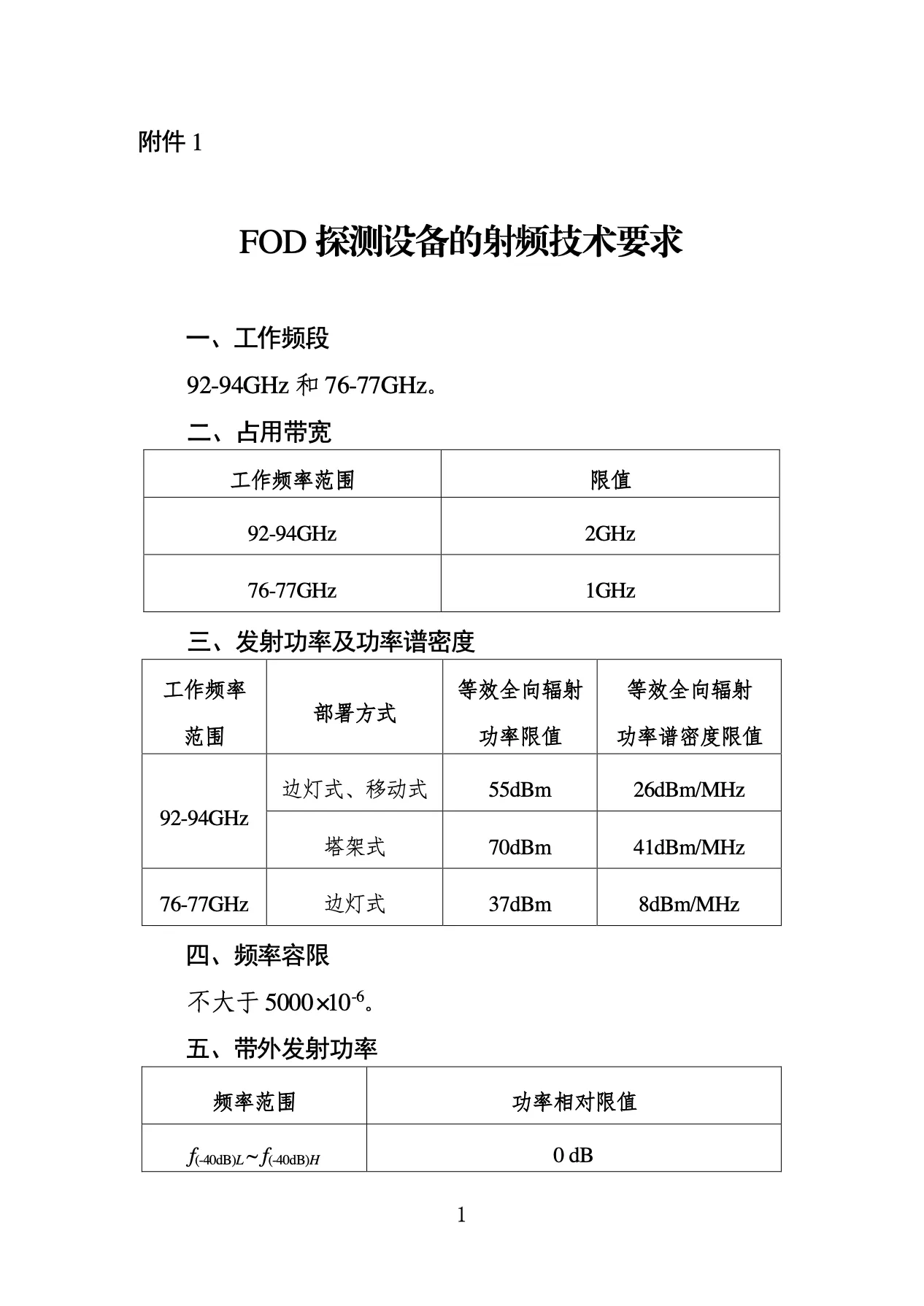 第三条 92-94GHz频段以主要业务划分用于固定、移动、无线电定位和射电天文业务,规划该频段作为FOD探测设备的主要使用频率,用于边灯式、塔架式和移动式FOD探测设备;76-77GHz频段以主要业务划分用于无线电定位和射电天文业务,规划该频段作为FOD探测设备的补充使用频率,用于边灯式FOD探测设备。FOD探测设备限在机场跑道区域设置、使用。