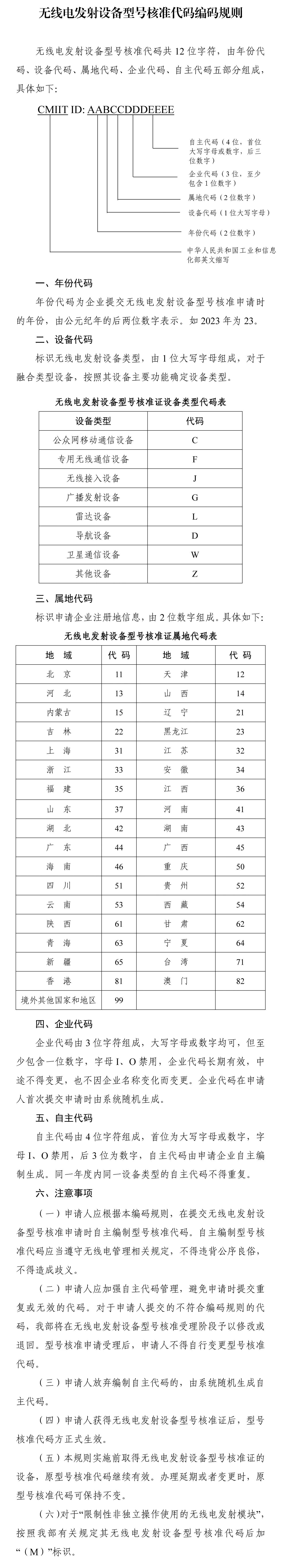 为贯彻落实《国务院办公厅关于深化电子电器行业管理制度改革的意见》(国办发〔2022〕31号),根据《无线电发射设备管理规定》(工业和信息化部2022年第57号令),优化无线电发射设备型号核准证书样式和代码编码规则,工业和信息化部组织修订了《无线电发射设备型号核准证书样式》和《无线电发射设备型号核准代码编码规则》,现予发布,自2023年12月1日起施行。《信息产业部关于加强无线电发射设备管理的通告》(信部无〔1999〕363号)、《工业和信息化部办公厅关于变更无线电发射设备型号核准代码格式的通知》(工信厅无〔2009〕9号)同时废止。